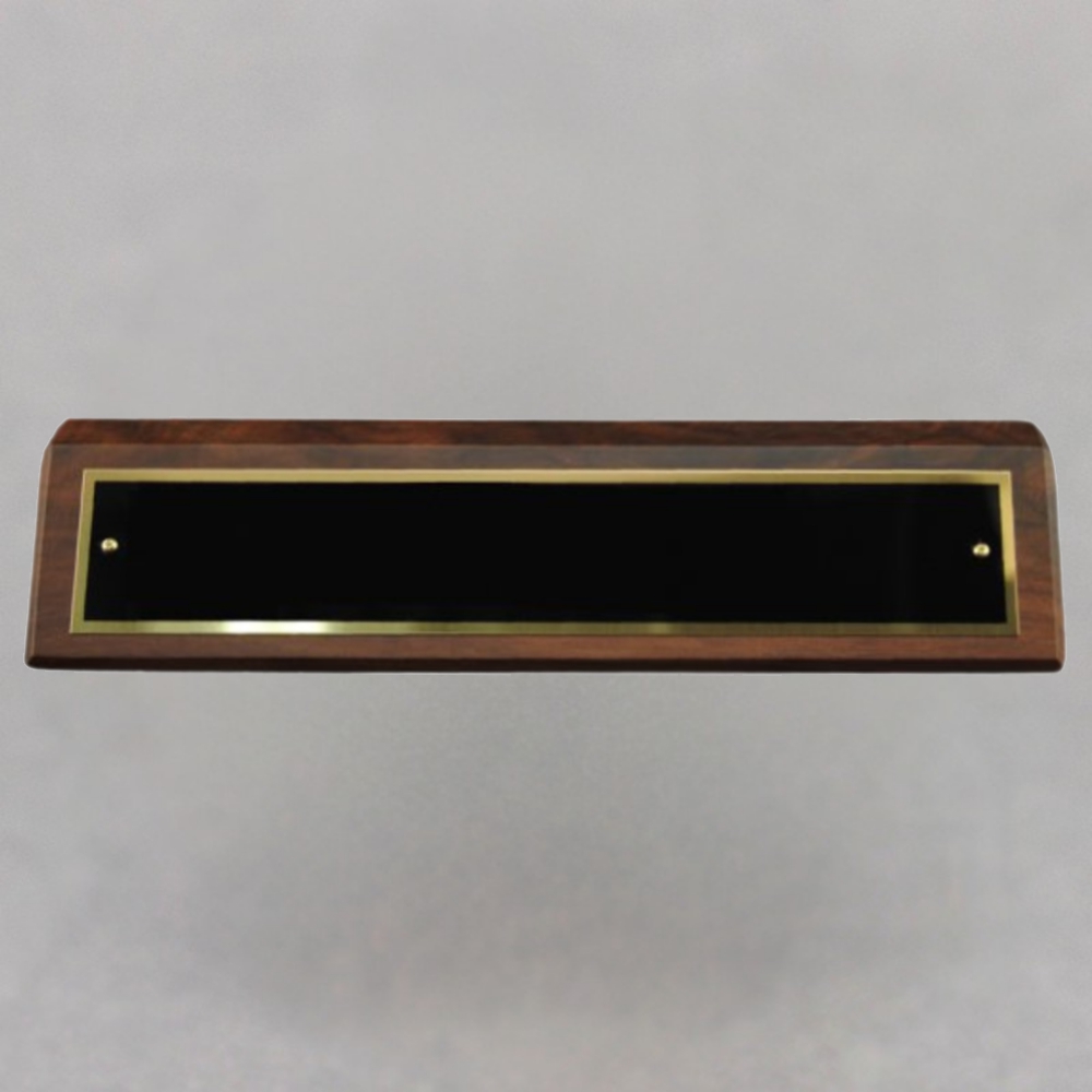 This black gloss engraving plate laser engraves a rich gold and attaches with two small brass screws that makes it removable and perfect for identifying board members that are periodically changed. The engraving plate can be ordered separately.