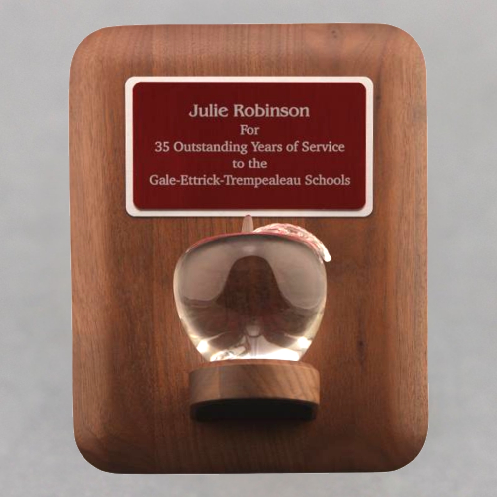 Permanently mounted on an elliptical solid walnut plaque is our signature optical grade crystal apple. Our Crystal Apple Plaque makes a unique and elegant way to recognize your outstanding performers.