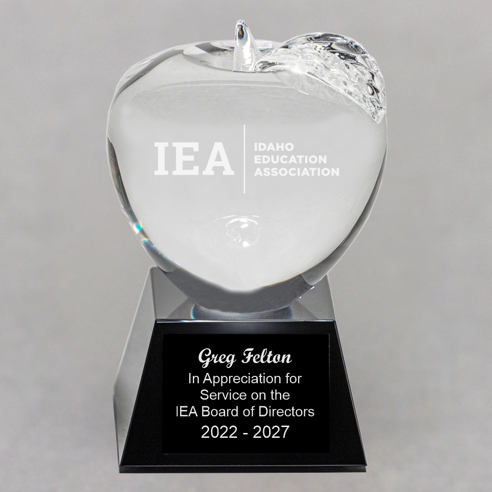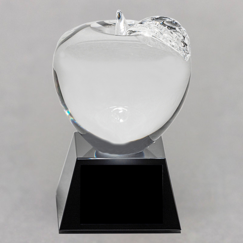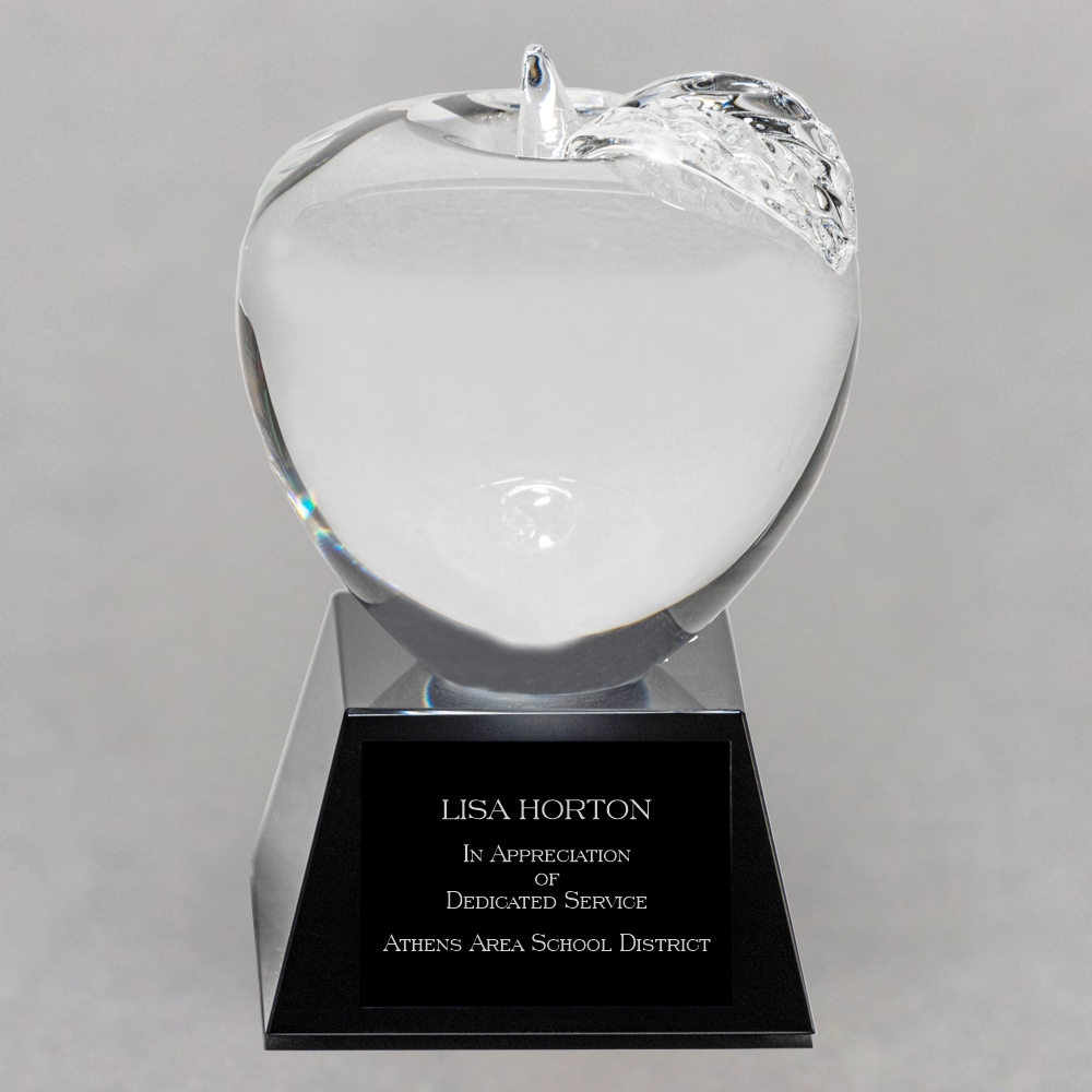Clear Crystal Apple on Black Crystal Base – Etched Apple and Engraved Plate 3″ to the top of the stem x 3″ in diameter Optical Grade Black Crystal Pyramid Base 1-1/2″ high by approximately 2-5/8″ square at the base. Apple is permanently attached to base. Black Aluminum Engraving Plate 1-3/4″ x 1-1/4″ This Clear Crystal Apple on Black Crystal Base – Etched Apple and Engraved Plate is perfectly & permanently mounted on a 1 ½” high pyramid shaped black crystal base. Also included is a 1-1/4″ x 1-3/4″ black aluminum laserable engraving plate with a highly polished which looks incredible with the crystal. Weighing a solid 2 pounds they boast incredible clarity & substance. It comes in a satin lined presentation box. Personalize it! Our price includes your custom message or logo sand etched onto the apple. The plate is also laser engraved with your logo and/or text. Your engraving will show through the black plate with a highly polished silver appearance which looks incredible with the crystal. A one-time set up charge of $15.00 will be added for logos not already on file with us. There is no setup charge for custom text. Click here for directions on sending logo artwork. We will notify you if your artwork needs additional modifications to make it usable. Other Personalization Options Etching on apple only, see item# 19AU-NE Engraving on base plate only, see item# 19A No personalization at all, see item# 19A-NE Award Ideas This Clear Crystal Apple on Black Crystal Base – Etched Apple and Engraved Plate makes a great recognition idea for an end of the year banquet for a Paraprofessional Staff Member, Teacher, or a Nurse. With the custom etched apple, you could add a special touch when showing gratitude to someone who has made a difference in your life. Please visit our sister site sportplaques.com for all of your Sports Recognition needs.