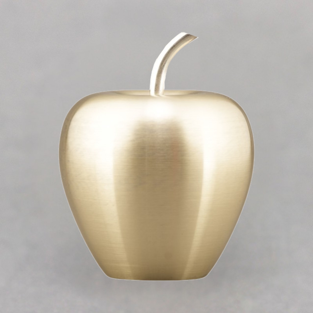 This Golden Brass Apple is contemporary in style and elegant in style. The gold coloring of this apple is very pretty, the gold is more subtle, it is not brassy at all. The apple is made of a thick industrial brass and features a brushed satin finish, a look that reduces that appearance of fingerprints and scratches. A tarnish resistant lacquer coating adds extra protection to this beautiful apple. You can proudly display this awesome apple on a desk, bookshelf, side table, mantel, or windowsill. It comes in a satin lined gift box.