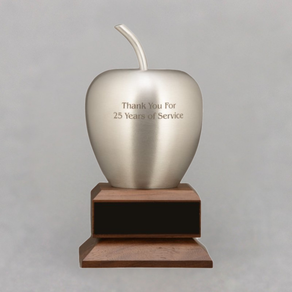 The Silver Aluminum Apple on Walnut Base – Engraved Plate Only would make a beautiful Retirement Gift, Appreciation Gift, or Thank You Gift for Teachers, Staff, Employees or to whom you would like to recognize.
