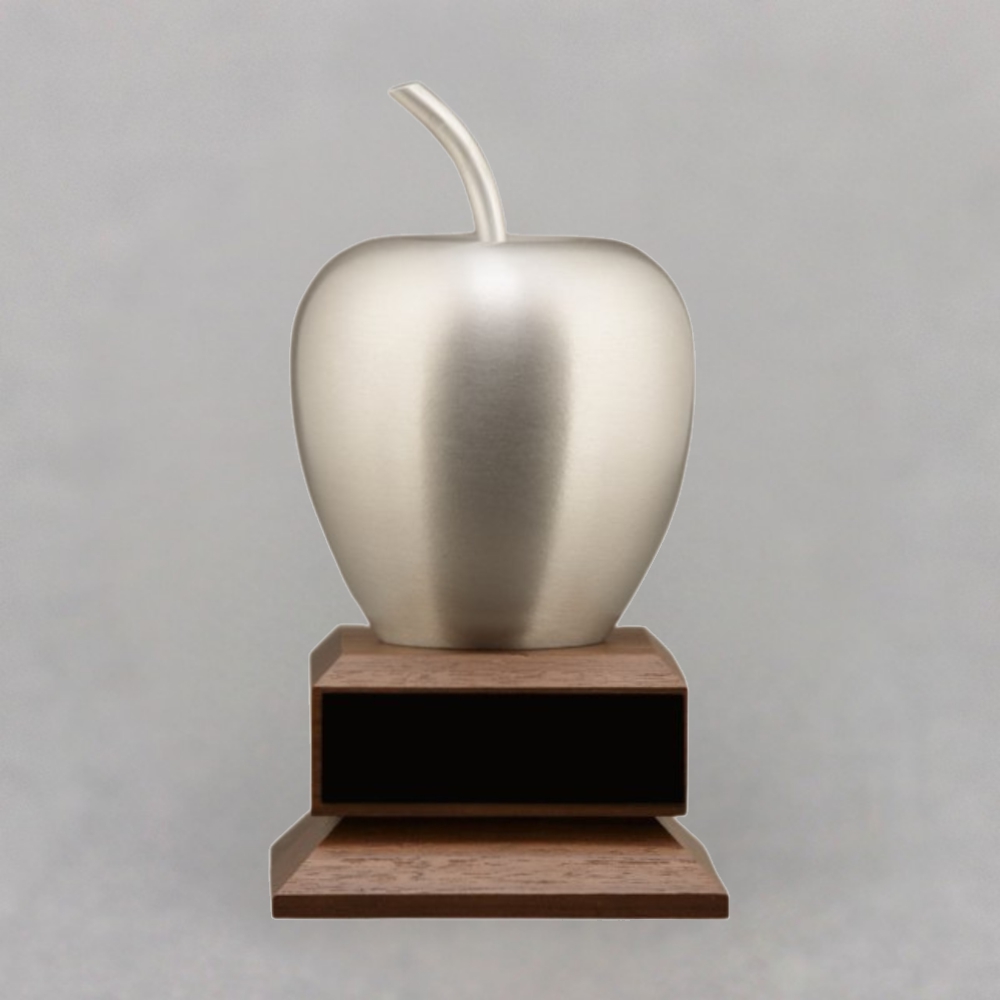 This Silver Aluminum Apple on Walnut Base – Engraved Plate Only is made of a thick industrial aluminum and features a brushed satin finish that has a tarnish resistant lacquer coating. This elegant look reduces the appearance of fingerprints and scratches. The heavy aluminum apple desk award measures 6-1/8” high when permanently mounted to its elegant walnut base. This award comes in a white corrugated box wrapped with tissue paper.