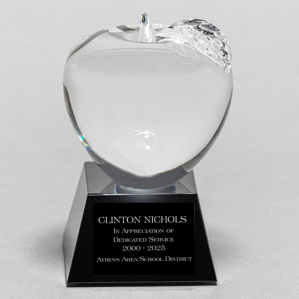 This Clear Crystal Apple on Black Crystal Base – Engraved Plate Only makes a great recognition idea for an end of the year banquet for a Paraprofessional Staff Member, Teacher, or a Nurse. With the custom etched apple, you could add a special touch when showing gratitude to someone who has made a difference in your life.