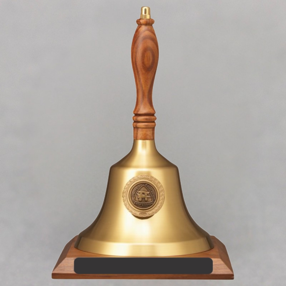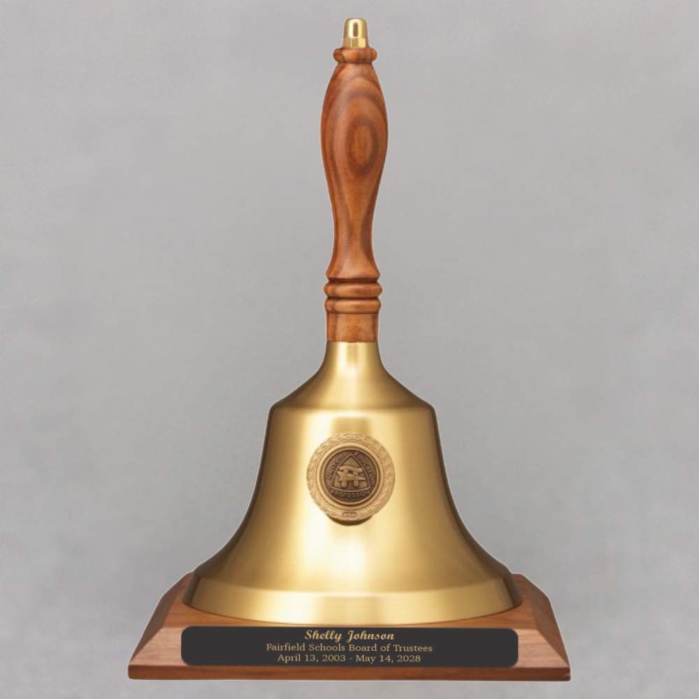 Teacher Hand Bells are a classic symbol of an honored profession, making them an excellent way to celebrate a special milestone or achievement. Our gold Brass Hand Bell features a beautifully brushed satin gold finish to give it an elegant look as well as to reduce the appearance of fingerprints and scratches. The Brass Hand Bell has a walnut finish wood handle and a tarnish preventative lacquer coating to keep it looking great for many years. Choose from 3 Brass Medallion options for the opposite side of the Hand Bell.